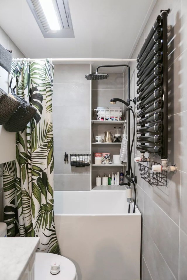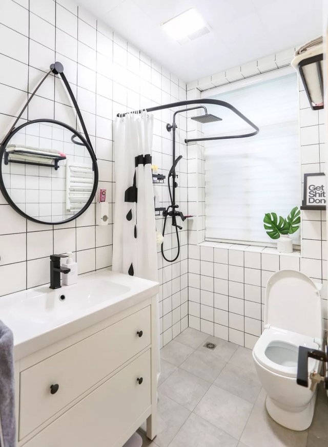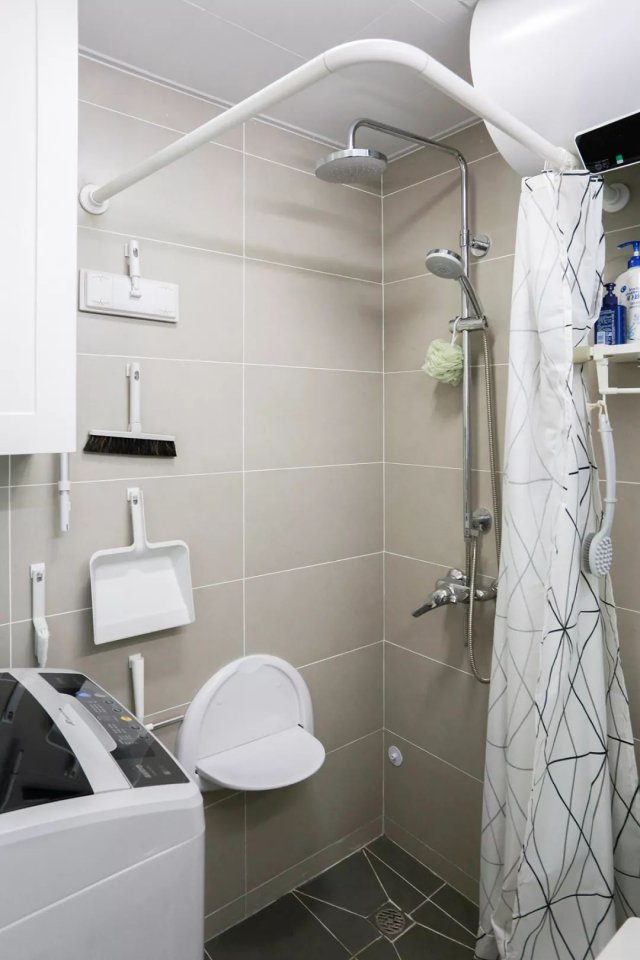 这时,可以换个思路,用浴帘挡住浴室柜和马桶,而不是把自己围起来。