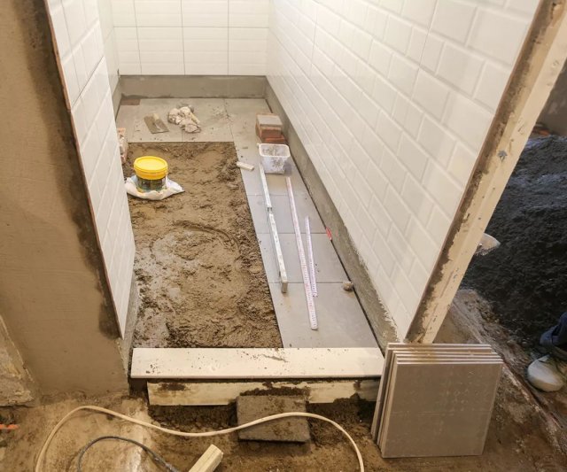 传统的地砖铺贴工艺,坡度全靠下边水泥砂浆调整