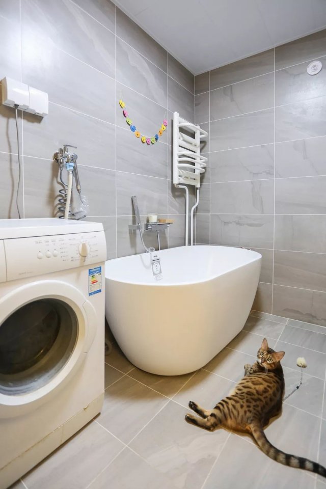 喜欢泡浴缸的话,坡度也不用费心找那么大了,挡水条也不用装了,就站在浴缸里洗吧。