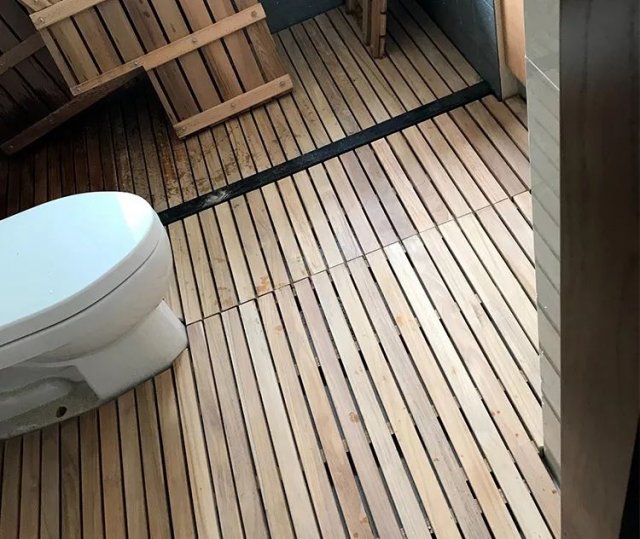 卫生间布局要改不了,那就只有铺满防腐木地板一条路。