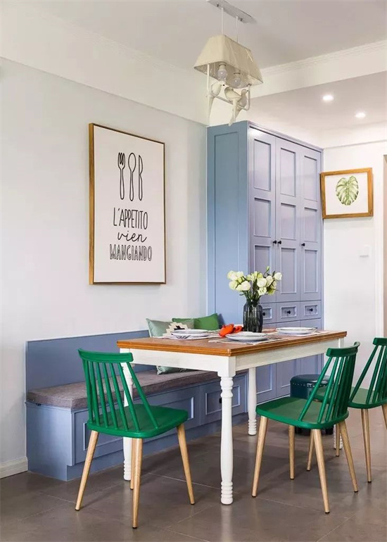 ▲小户型餐厅空间相对较小,卡座式的餐桌椅很适合,卡座也可以作为入户换鞋凳来使用。侧方的餐边柜还搭配了一个小黑板,让餐厅空间显得更有格调感一些。