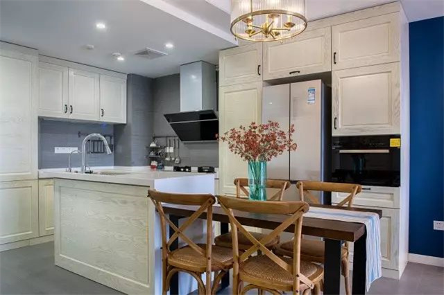 ▲餐边柜也是和厨房橱柜连着在一起,烤箱和冰箱都嵌入了柜子里面,这样做可以把空间利用的最充分。餐桌和岛台连在一起,不占用额外的活动空间。