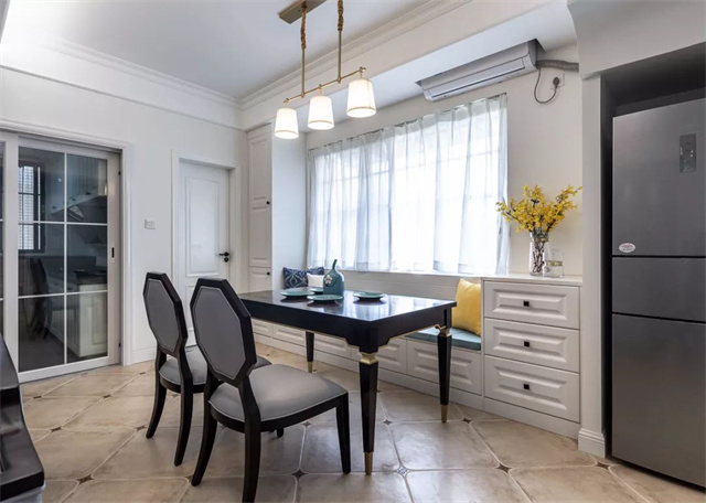 卡座组合收纳柜的设计,在靠窗的位置做上卡座,吃饭的时候也能欣赏一下窗外的美景,而冰箱嵌入墙内,也显得更有整体感。