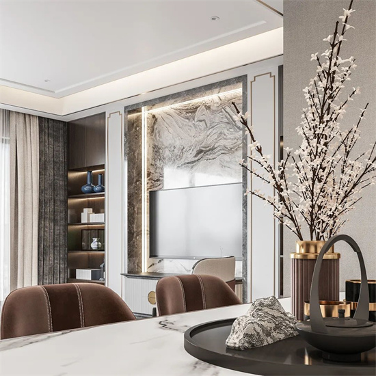 基于现代主义家居的简约时尚,又融入中式家居的文化内涵,贯通中西、时尚优雅的新中式主义家居设计,成为家居国潮风的代表之一。中山帮忙装修网公司分享。