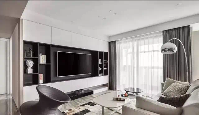 客厅电视墙还可以利用壁龛整体收纳,下方壁龛代替电视柜,两边对称壁龛隔板收纳。视觉极简还能满足功能性,同时还节省了电视柜,让空间更宽敞。