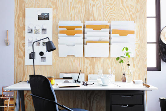 聪明人的办公桌一定是整齐而多功能的,这里可以挂起你的钱包或者公文包,处理电子邮件,把第二天要带去公司的文件搁在这里,出门的时候也一定不会忘记。顶层的文件盒也是最明显的地方,装一些你想看得见、记得带的东西,比如需要邮寄的信件。下面的文件夹装一些经常处理的文件,比如账单。桌面上的托盘盒装手机、ipod等小物件,盒子外围可以用丝带稍微点缀一下。桌子侧翼用来放笔的牙缸架和挂钥匙的S形铁钩功不可没,而桌边挂衣钩的出现让手包和公文包在使用时垂手可得。