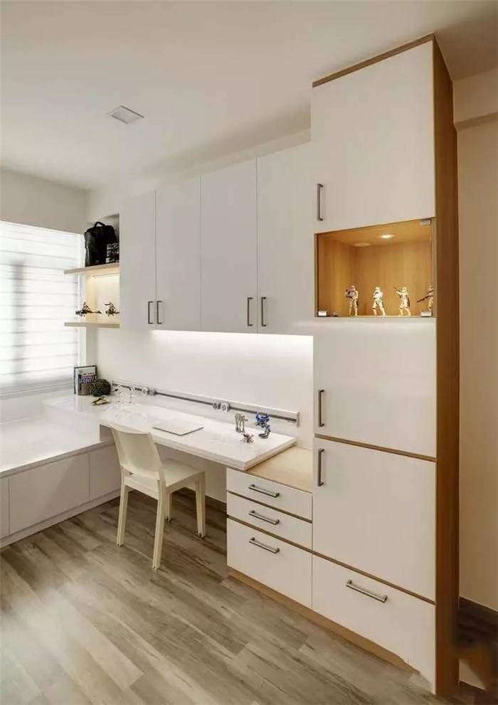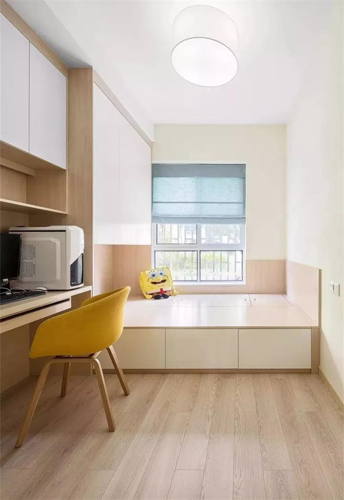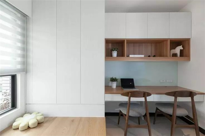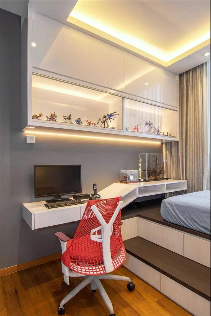 为了丰富榻榻米房的书桌,也可以取消大面积的书柜与衣柜,直接把书桌延伸到床尾,床尾的地方也可以当作座位,电脑可以充当电视,躺在床上看剧,非常不错。