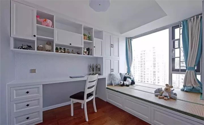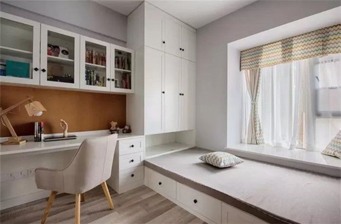 如果安装榻榻米的这间卧室,主要功能是书房或者书比较多的话,可以在榻榻米床的周围设计收纳书柜,如果床的长度不够,设计成吊柜也不错。