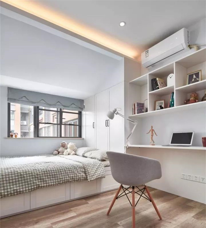 这间房满满的收纳储物设计,床下有抽屉式柜体,可以收纳日常生活小物件,床头的柜子可以收纳衣物或者被子,与衣柜一体的书架下方是个小小书桌,一方小空间,却功能满满。