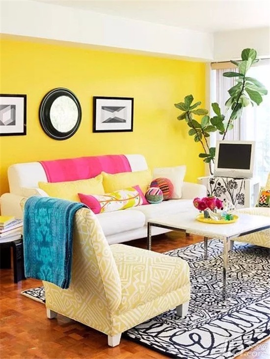 鲜黄色的阳光气息的墙面,白色的长沙发上用了活泼色彩的软装搭配。特别的棕色的木质地板,不仅色调压制住了过于轻狂的软饰,木头的纹路也丰富了客厅的味道,真的很漂亮。
