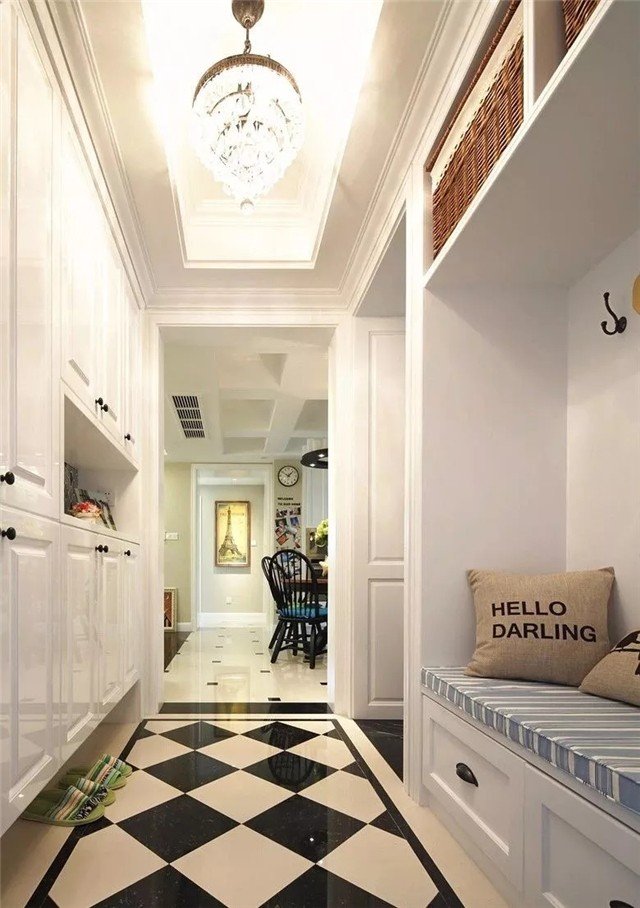 玄关地面以黑+白斜铺的地砖,进门后左侧摆放了白色鞋柜,与黑白相间的地砖形成鲜明对比,而右侧摆放了鞋凳,坐垫是蓝白条纹的软垫搭配棕色抱枕,结合了实用与清新的小情调。