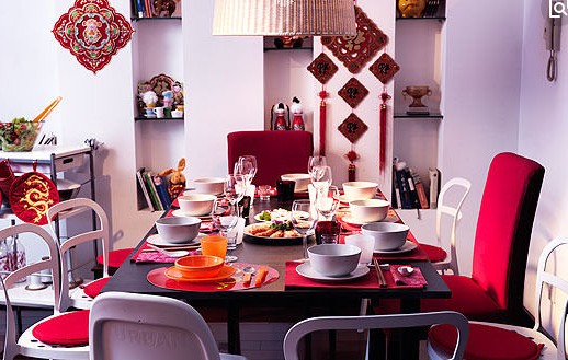 逢年过节总少不了大餐,如何让餐厅呈现一片喜庆?自然少不了对餐桌的点缀了。例如餐桌换新装——给椅子套上红色坐垫,餐桌换上喜庆的红色桌布和碗垫,在此基础上,配置精致的新春碗筷、插花,都是提升年味的重要法宝。如果你家的餐桌正好是圆形的那就更好啦,轻松营造复古气息。